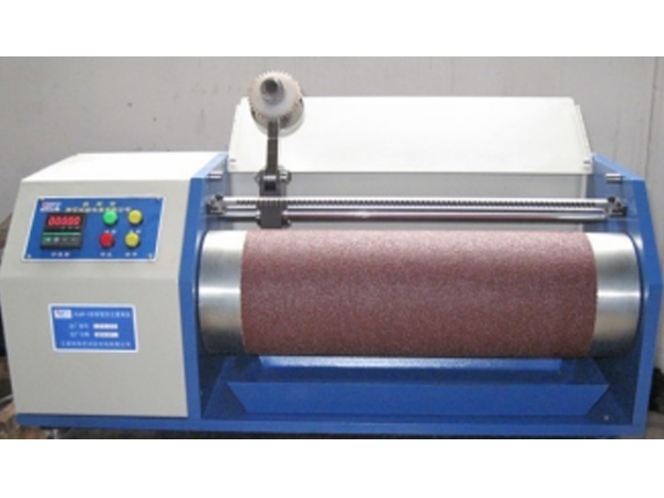 該機(jī)主要由動(dòng)力系統(tǒng)、轉(zhuǎn)動(dòng)輥筒、試樣夾持器、輥筒轉(zhuǎn)動(dòng)圈數(shù)記錄裝置、齒輪齒條、行程保護(hù)裝置、機(jī)座及集塵盤等組成。其主要原理是:在某一載荷下,柱狀試樣在一定級別的砂布上橫移研磨一定行程,通過測量試樣的質(zhì)量磨耗量,再由試樣的密度計(jì)算出體積磨耗量。在同一條件下,試驗(yàn)?zāi)z的體積磨耗量與標(biāo)準(zhǔn)參照膠體積磨耗量具有可比性。