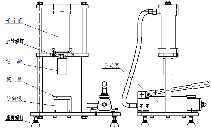 選擇與電纜銅芯大小相等的芯軸,安裝在千斤頂?shù)妮S上,并用螺釘固定,前后移動模板,使電纜銅芯對準芯軸或一手操作手動泵,使電纜銅芯伸出對準芯軸,繼續(xù)按壓手動泵,直至電纜銅芯被擠出。